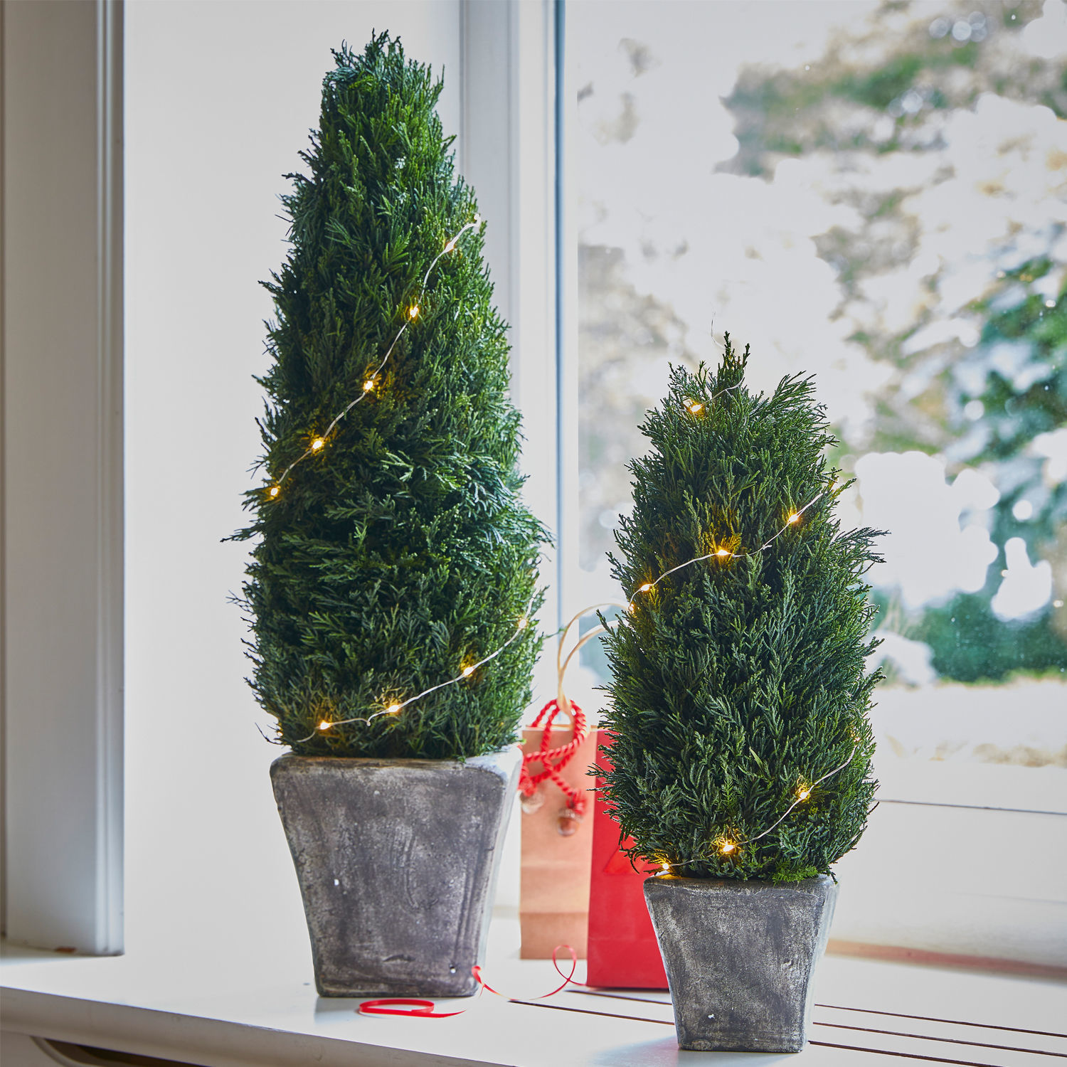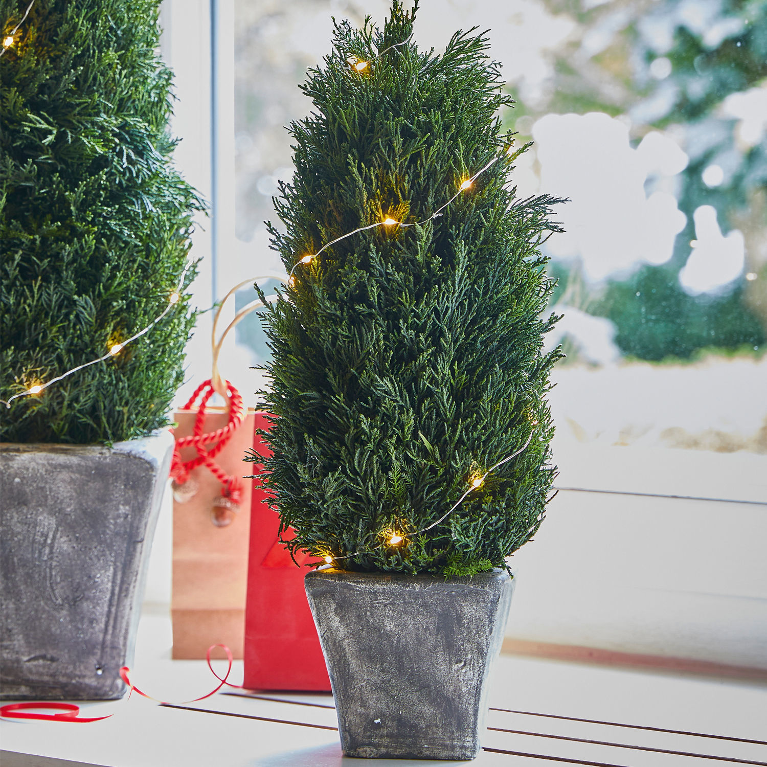 Zypressen prägen das Landschaftsbild der Toskana wie die sanften Hügel und die darin eingebetteten noblen Landsitze. Sie säumen die Auffahrten zu den herrschaftlichen Villen, setzen imposante Akzente in der Gartenanlage und werden in den Wintermonaten auch gerne in die Häuser geholt, wo sie im Eingangsbereich wie in den Wohnräumen als grüner Raumschmuck willkommen sind. Doch so prächtig Zypressen unter freiem Himmel aussehen und im ersten Moment auch in den Häusern, altern sie wie die heimische Tanne in unseren gut geheizten Zimmern schneller als uns lieb ist. Nicht aber diese Zypresse im 2er Set. Warum nicht? Ganz einfach, weil sie unter den Händen erfahrener Floristen quasi ein neues Leben geschenkt bekommen hat. Denn für diese Zypresse im 2er Set wurden echte, handverlesene Zypressenblätter und Zweige in einem aufwendigen Prozess konserviert und dann ein neues botanisches Prachtstück daraus gefertigt. Ein schön gewachsener, immergrüner Zypressenbaum, der den echten Kollegen in der Natur optisch in nichts nachsteht, ihnen in puncto Lebensalter aber haushoch überlegen ist. So kann die Zypresse im 2er Set der exklusive Schmuck Ihrer Advents- und Weihnachtsdekoration werden, der bis weit über das Fest hinaus prachtvoll dasteht. Die noble Ausstrahlung der beiden Zypressen wird natürlich noch durch die Wahl des Topfes unterstützt. dieser ist – wie könnte es anders sein – aus echter Terrakotta und mit einem authentischen Antik-Finish veredelt.